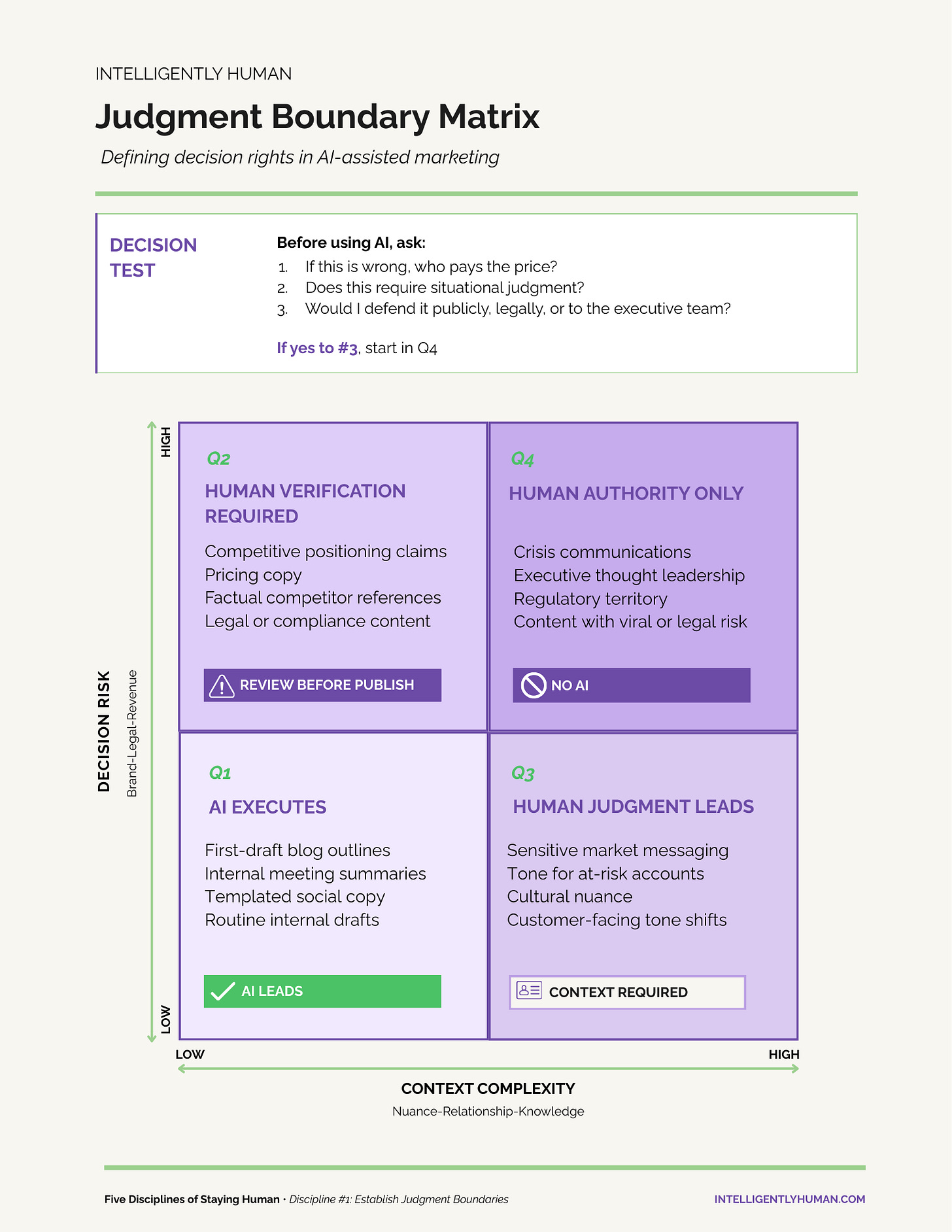 The framework gives marketing teams a repeatable way to classify AI-assisted content decisions before they enter the review process. It maps decisions across two factors: how much is at stake if the content is wrong, and how much contextual judgment the decision requires. The intersection of those two dimensions determines who owns the decision.
