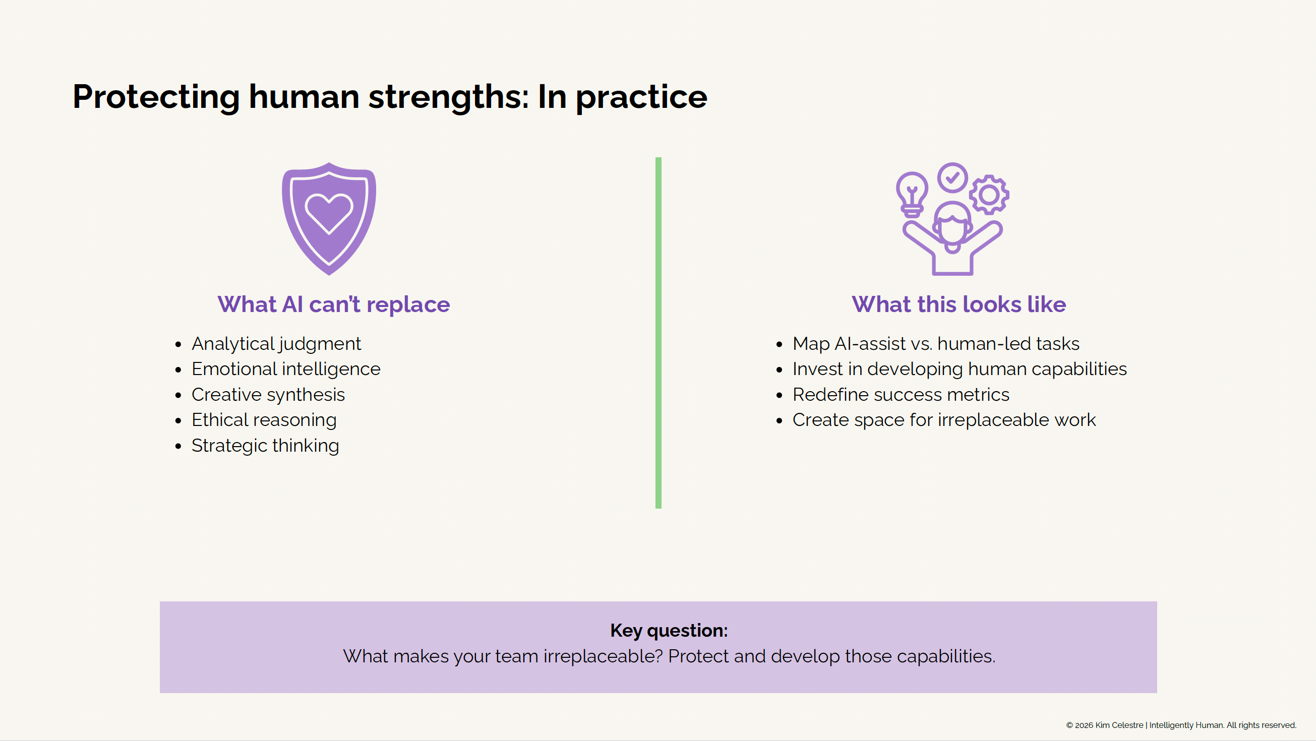 Lena used the Human Strengths Protection Map to give the conversation structure. The team worked through the eight capabilities together, identifying where expertise existed, where it thinned, and where the restructuring impacted its development. By the end of the session, each person named one strength they wanted to build and one way Lena could support their development.