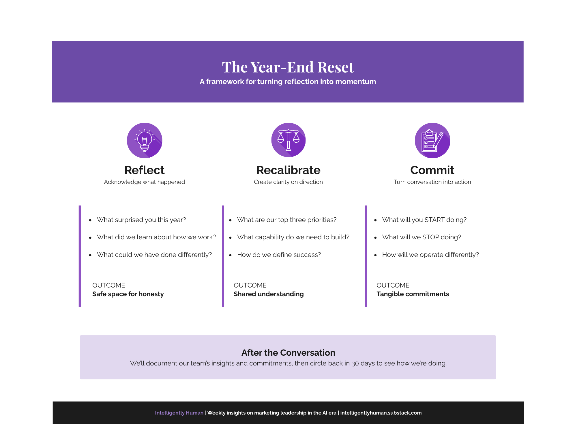 1. Reflection before action. People can’t move forward productively until they’ve processed what actually happened. Skipping straight to “2026 goals” when your team is still reeling from 2025 creates fake momentum, not real commitment.